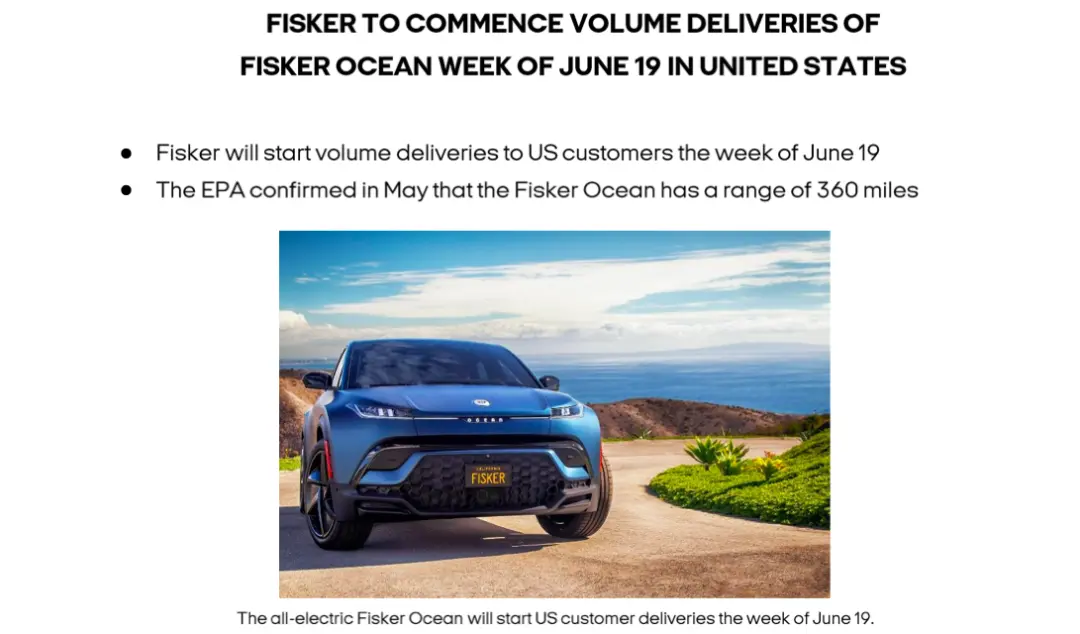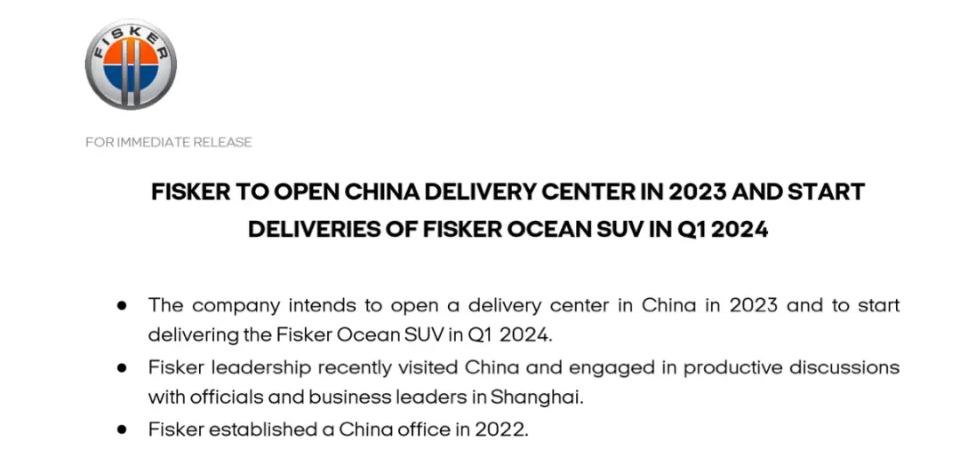 菲斯克在其官方发布的新闻稿中称,最快今年就会在中国设立交付中心,并计划在2024年一季度开始向中国消费者交付旗下首款车型Ocean。