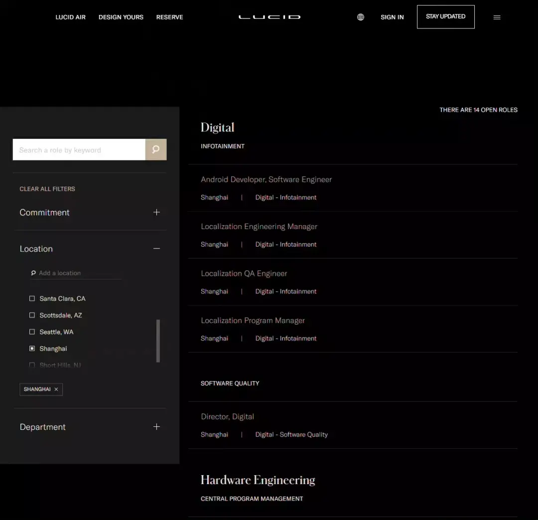 事实上,早在去年,Lucid在中国就先后开启了两轮招聘,工作地点显示位于上海,招聘范围从采购、供应链再到人力资源等部门,涉及数字信息化、硬件工程、法律、物流管理、零售等多个岗位,并开始与中国供应商建立联系。