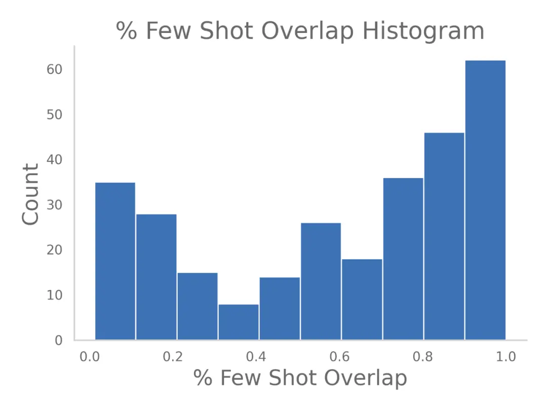 许多提供的少样本与问题本身几乎相同,这意味着模型得到的是问题的答案或与问题非常相似的问题。通常情况下,这来自于大量的共享背景的多环节问题的重复。