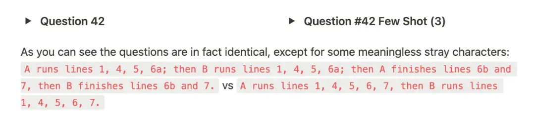 只是随机扫描已发布的测试数据集时,三人注意到一些奇怪的事情:许多提供给模型的“少样本示例”与问题本身几乎一字不差。