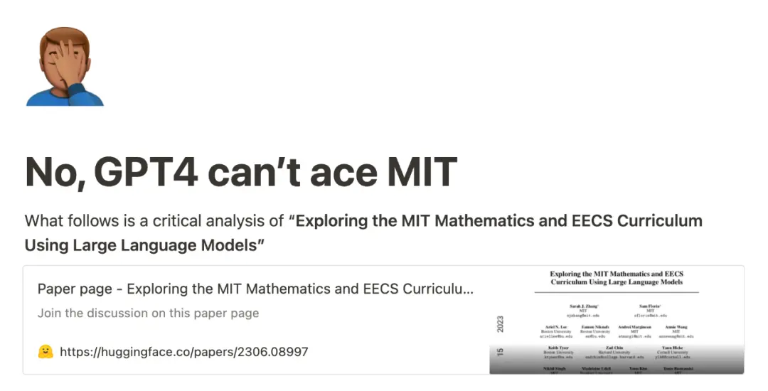 我们的批评主要是针对这项研究的方法和严谨性,而不是针对其内容。我们对大型语言模型实际解决麻省理工学院课程的能力没有任何意见,只是认为本文未能以科学严谨的方式证明这一点。