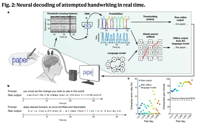 利用脑机接口帮助残障病人实现实时书写。图片来源:《High-performance brain-to-text communication via handwriting》