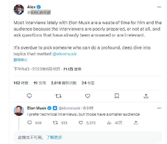 马斯克回应称:“我更喜欢技术访谈,但这类采访的受众较少。”
