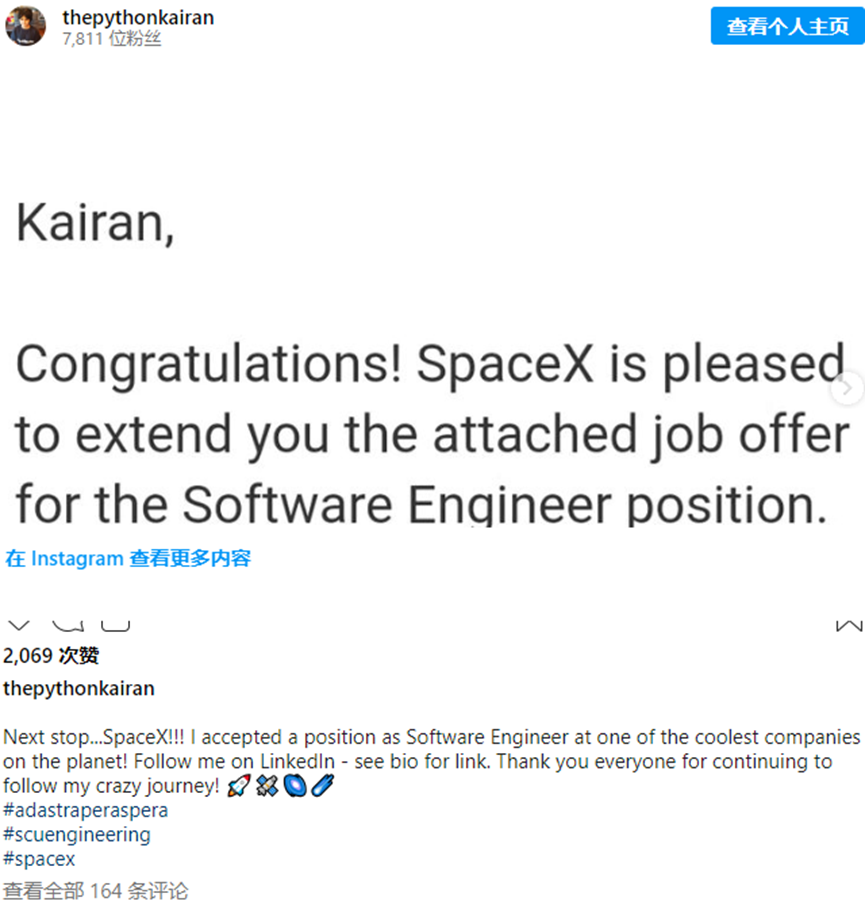 据悉,SpaceX的入职成功率只有0.2%,比进哈佛还难,他的经历让很多人非常羡慕。