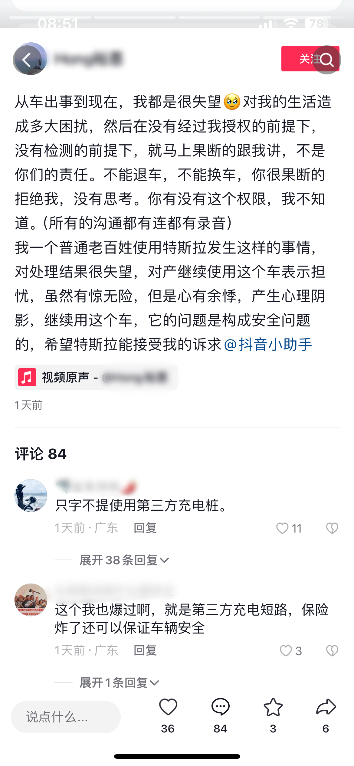 她质疑特斯拉方面推卸责任,不能退车,不能换车,对继续使用这辆车表示担忧,希望特斯拉能接受她的诉求。
