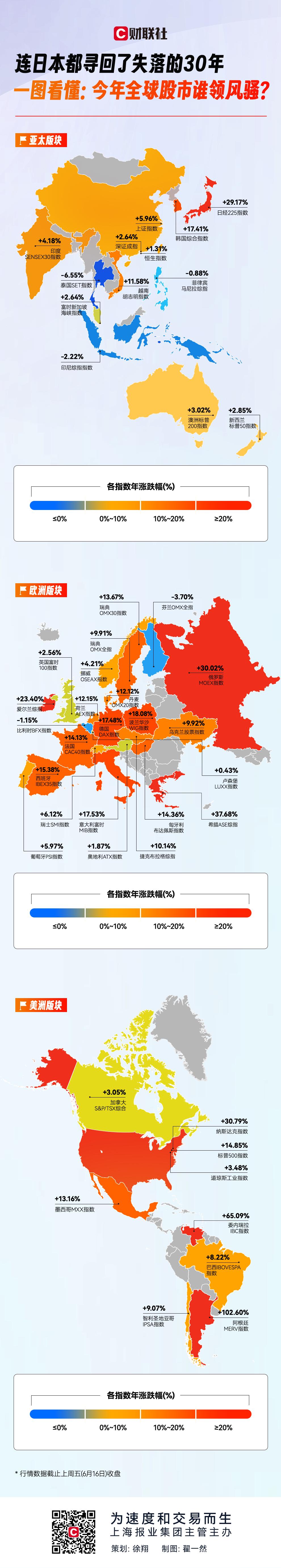 眨眼间,2023年已经接近走过了一半。在过去几周,日本、韩国和越南股市纷纷以大涨姿态掀起了一轮“亚洲风暴”。但其实放眼全球,这些亚洲股指的涨幅还不算特别拔尖。姑且不算年内因本币贬值和恶性通胀,而分别大涨了102%和65%的阿根廷和委内瑞拉股指,美国纳指、希腊ASE综指和俄罗斯MOEX指数的涨幅也均超过了30%。