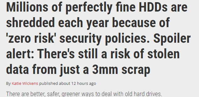 ·PC玩家在处理废弃不用的老旧硬盘时,比较简单粗暴的基本都是暴力摧毁,然而其中还是存在这不少隐患,对于如今的数据恢复技术高手来说,即使是用户把硬盘砸成3mm硬盘碎片也可恢复数据,机械砸毁并不会给前用户带来最好的隐私保护。