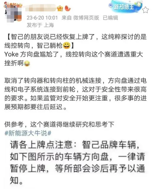 不过该汽车博主很快修改了微博,称“智己的朋友说已经恢复上牌了,这纯粹探讨的是线控转向,智己躺枪”。