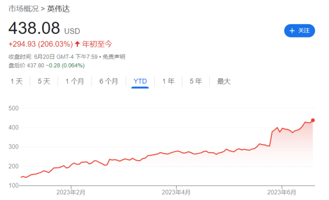 今年迄今为止,英伟达的股价已经飙升了194%,过去一个月累计上涨37%,市值飙升至超过万亿美元,成为美国市值第五大的公司。