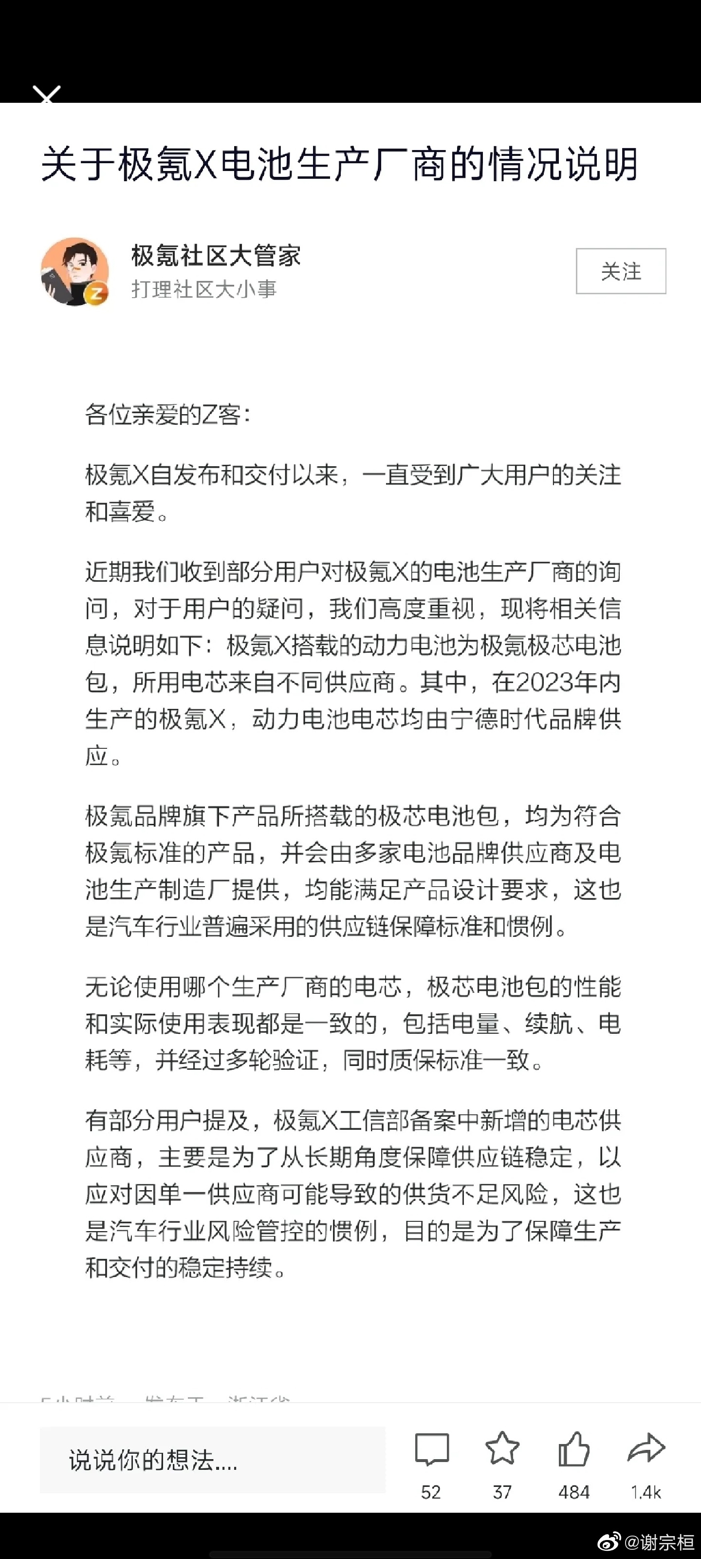 有部分用户提及,极氪X工信部备案中新增的电芯供应商,主要是为了从长期角度保障供应链稳定,以应对因单一供应商可能导致的供货不足风险,这也是汽车行业风险管控的惯例,目的是为了保障生产和交付的稳定持续。
