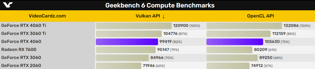 如果对比RX 7600有一定的领先优势,但是GeekBench计算测试不太适合跨厂商和跨架构对比,而从规格上看,RX 7600事实上有希望略微领先RTX 4060,或者基本在同一档次。