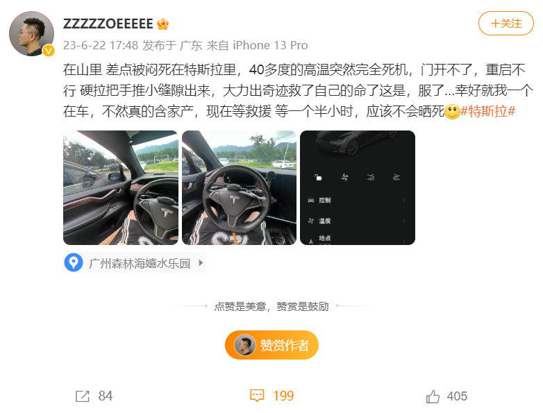 如果车辆死机,车门也完全打不开,车主又高温天气独自在外面的话,可能还会有安全隐患。日前有车主爆料称,他在山里驾驶特斯拉Model X,差点被闷死在特斯拉里。当时外面有40多度的高温天气,车辆突然完全死机,门开不了,重启不行。