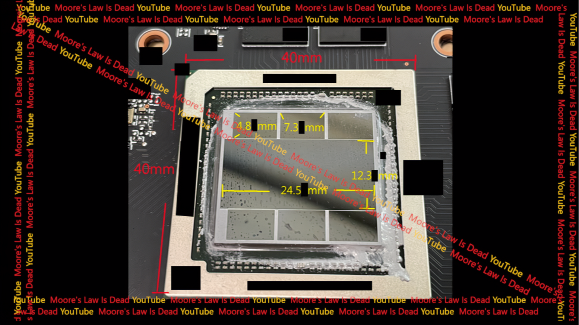 在《摩尔定律已死》泄露的图片中,我们可以看到 Navi 32 GPU 泄露中看到的相同封装中装有 Navi 31 GPU。 中间可以看到 Navi 31 GCD,其尺寸相同为 304.35mm2,而 6 个 MCD 的芯片尺寸为 529mm2。 但主要区别在于,Navi 31 GPU 安装在一个更紧凑的封装中,尺寸仅为 40x40mm,而库存 Navi 31 封装的尺寸为 55x47.5mm2。 封装面积减少了 39%。