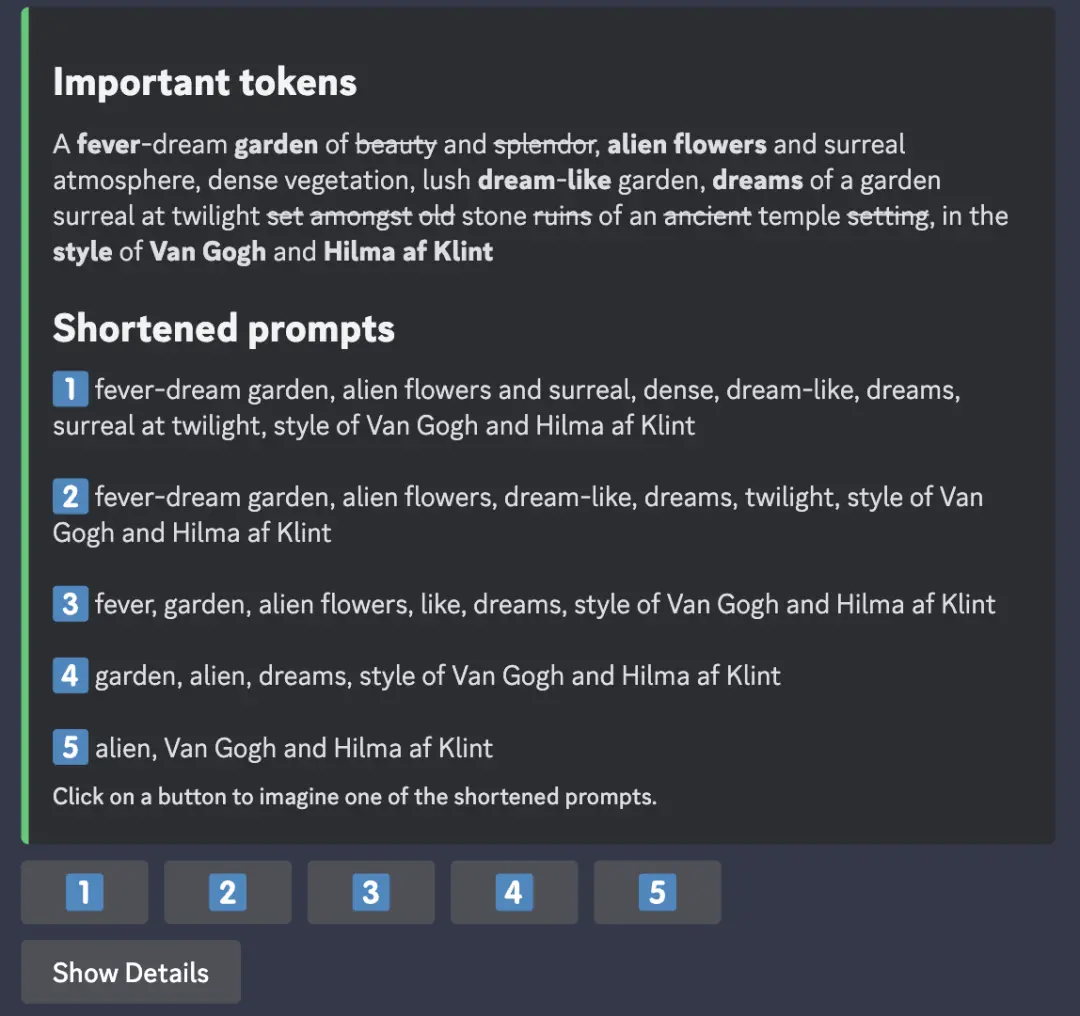 另外一个值得关注的新功能是“shorten command”,允许用户对 prompt 进行分析,从而了解哪些单词不会对输出图像产生任何作用,哪些单词是决定输出图像效果的关键。
