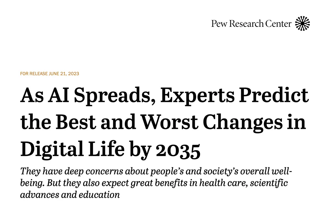 皮尤研究中心(Pew Research Center)6月21日发布一份报告,邀请305位专家预测,随着人工智能的发展,人类2035年的数字生活将发生哪些好的和坏的变化。在生成式人工智能和一系列其他人工智能应用的推动下,参与皮尤研究中心新一轮调查的专家们对2035年生活各方面的数字化进步抱有很大期望。