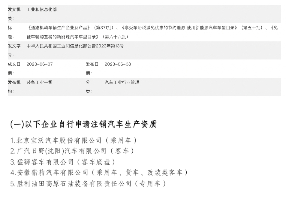 近日工业和信息化部官网公示的《道路机动车辆生产企业及产品》(第371批)第四部分公布了“被撤销的企业及产品”的名单。其中“自行申请注销汽车生产资质的企业”一项包括“北京宝沃汽车股份有限公司”,自公告发布之日起,北京宝沃将停止相关生产。