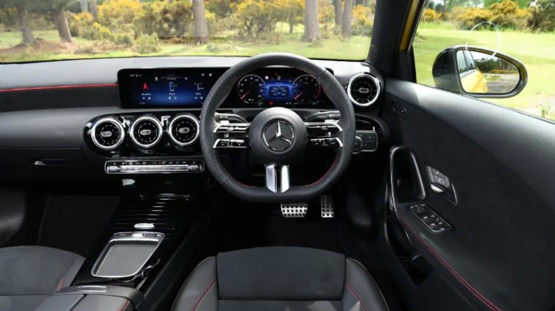 在内饰设计上,最大的改动就是更换了全新造型的方向盘,MBUX交互机制经过了大改,变为了储物格,并加入了更为醒目的红色缝线,加上原有的双联屏设计,圆形空调出风口,随处可见的翻毛皮装饰,纯黑色的内饰等元素,将豪华感和运动感进行了的结合。