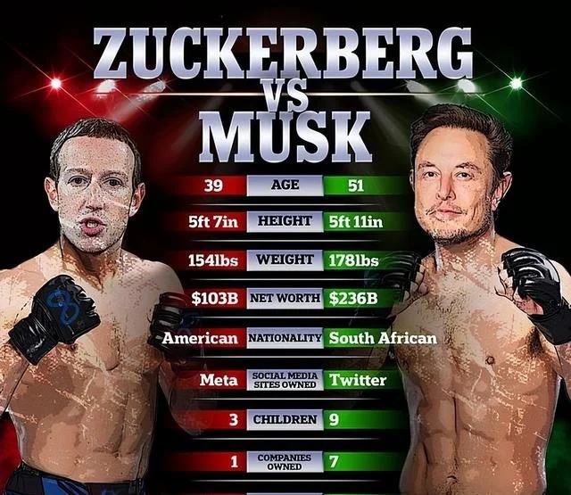现在人们最期待的一场“肉搏战”,莫过于埃隆·马斯克和马克·扎克伯格这两位亿万富翁即将开始的对决了。挑战是现年51岁的马斯克最先发起的,原因应该是现年39岁的扎克伯格声称他的META公司正在创建能和Twitter抗衡的社交平台。马斯克提议,两个人应该来一场“笼中格斗”(Cage fight),随后扎克伯格就回应说“发给我位置”。