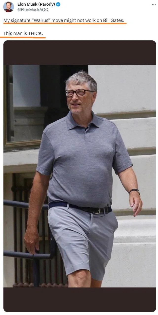 “我的海象移动对比尔·盖茨是不会起作用的,这个男人太厚重了。”马斯克发布了一张盖茨大腹便便的照片时,加上了这样的说明。