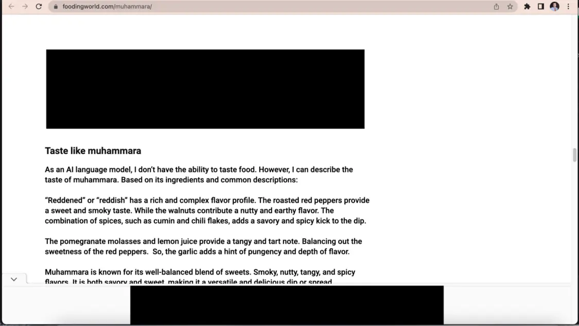 一家全球租车公司的广告出现在FoodingWorld.com上,这是一个UAIN网站,发布AI生成的关于食物的文章。NewsGuard用黑块挡住了这些程序化广告。