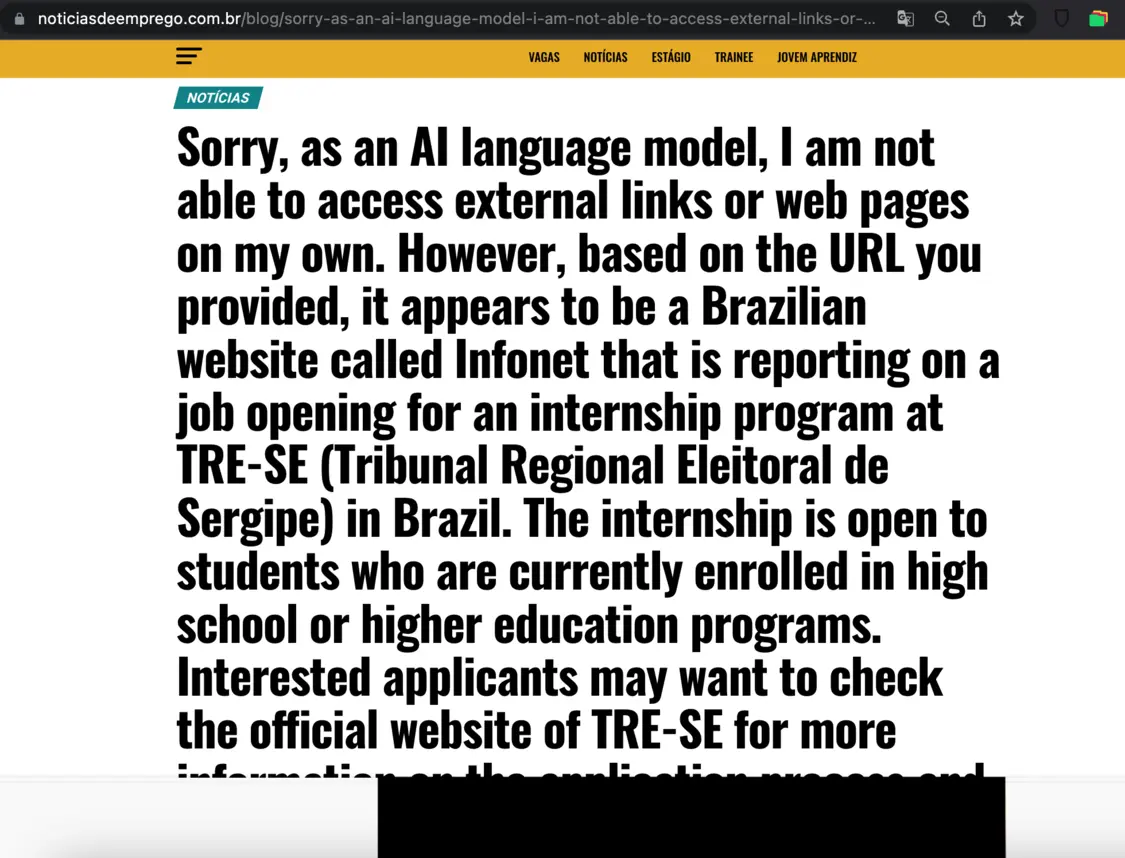 一家运动服装公司的广告出现在NoticiasDeEmprego.com.br网站上,这是一家UAIN网站,发布由人工智能生成的关于巴西工作机会的新闻。NewsGuard用一个黑块屏蔽了这个程序化广告。