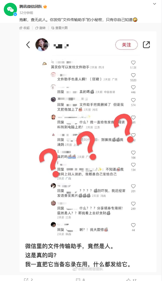 对此,腾讯微信团队官微也火速回复称:“抱歉,查无此人。你发给“文件传输助手”的小秘密,只有你自己知道”。
