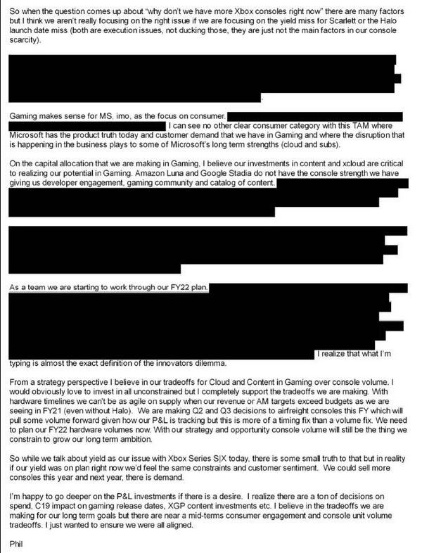 邮件的对话提到了在 Xbox 主机数量或是在游戏内容和云技术赌注投资之间的权衡。斯宾塞说道:“从战略角度来看,我相信我们会在游戏中的云和游戏内容以及游戏主机数量之间进行权衡。根据我们的战略和机遇,主机销量仍将是我们实现长期目标的制约因素。”