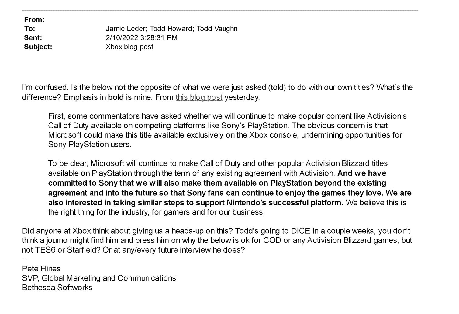 这封邮件来自于2022你那10月,在信中Pete Hines表达了自己的担忧,他不理解为什么被微软收购之后Bethesda的《星空》要求作为Xbox和PC独占,而动视暴雪的《使命召唤》却不用受到限制。