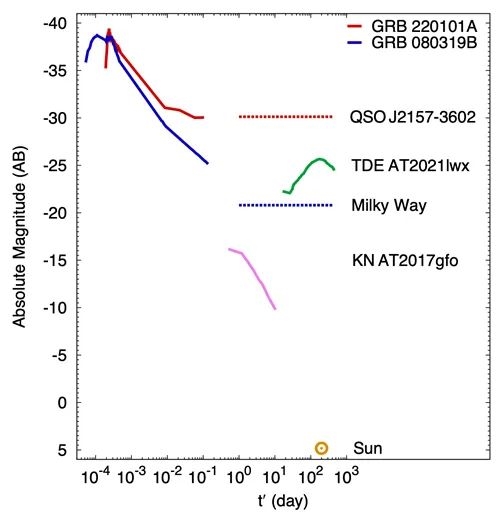 经过分析得知,GRB 220101A的绝对星等达到了-39.4,这也是人类目前探测到的唯一一个绝对星等亮于-39等的光学紫外辐射源。