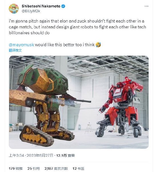 马库斯写道:“我要再次强调,埃隆和扎克不应该在笼子里打架,而是应该设计巨型机器人来打架,就像科技亿万富翁应该做的那样。”