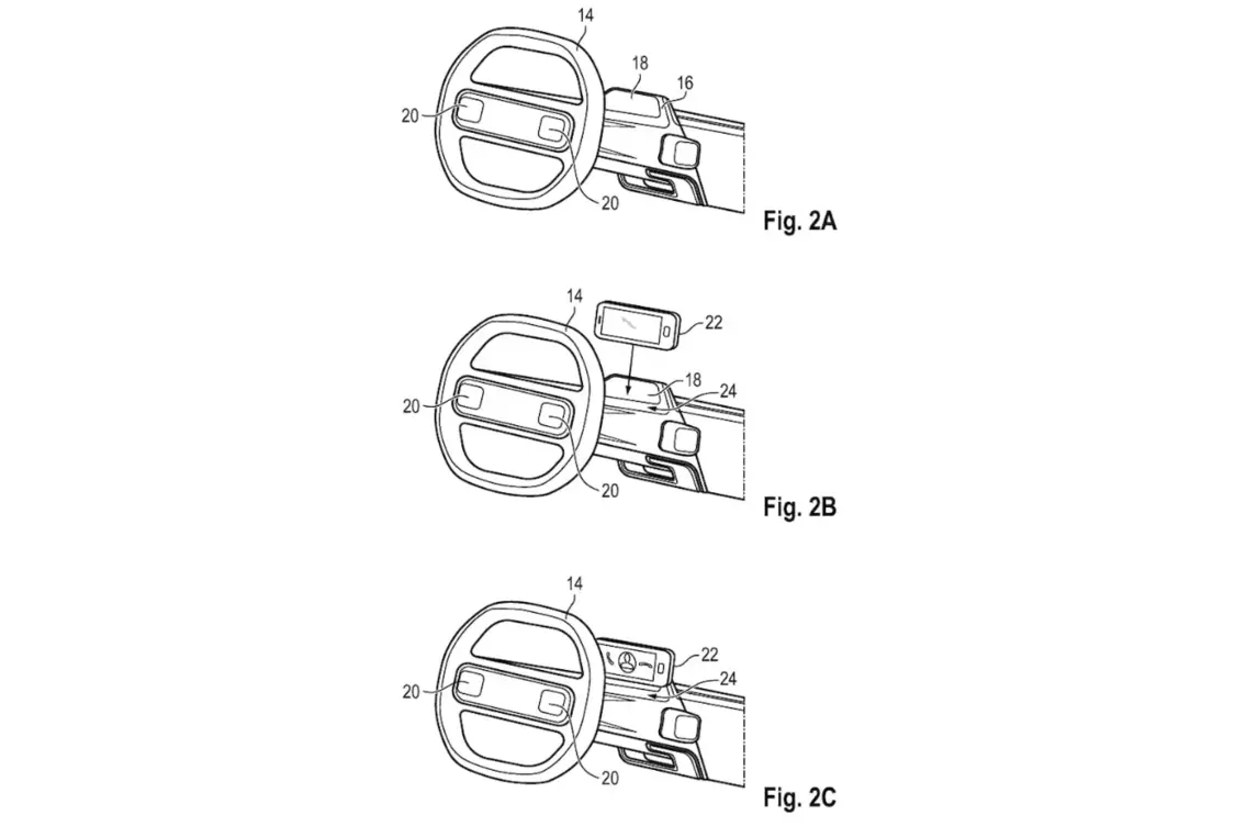 从大众汽车的专利图来看,可拆卸仪表盘还是设置在“老位置”,上手难度并不高。不过,厂商将移动设备的尺寸越做越大,暂且不说平面电脑和折叠屏手机,直屏手机的屏幕尺寸都已经直逼7英寸,专利图上的方向盘的镂空面积仍然不够大。