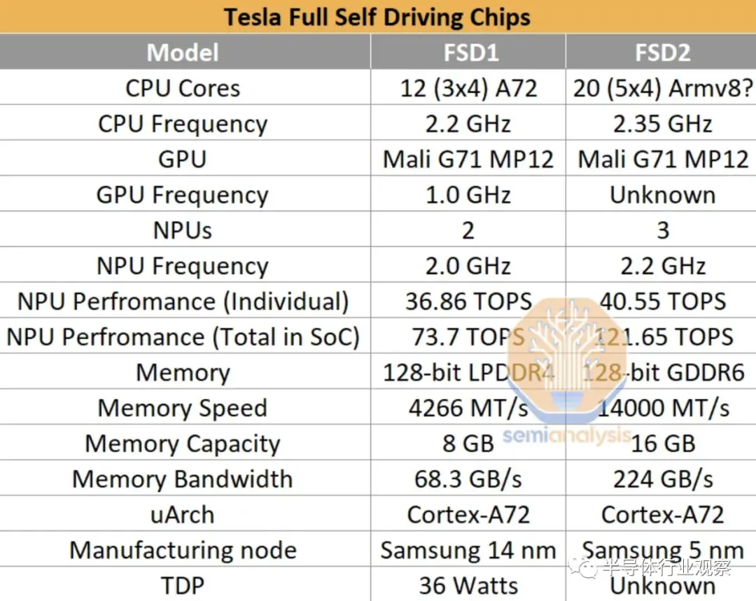 虽然训练芯片是由台积电制造的,但在特斯拉电动汽车内运行人工智能推理的芯片被称为全自动驾驶(FSD)芯片。特斯拉的车辆型号极其有限,因为特斯拉有一个非常顽固的信念,即他们不需要汽车的巨大性能来实现完全自动驾驶。此外,特斯拉的成本限制比 Waymo 和 Cruise 严格得多,因为它们实际上出货量很大。与此同时,Alphabet Waymo 和 GM Cruise 正在使用全尺寸 GPU,在开发和早期测试期间,其汽车成本要高出 10 倍,并且正在寻求为自己的车辆制造更快(也更昂贵)的 SoC。
