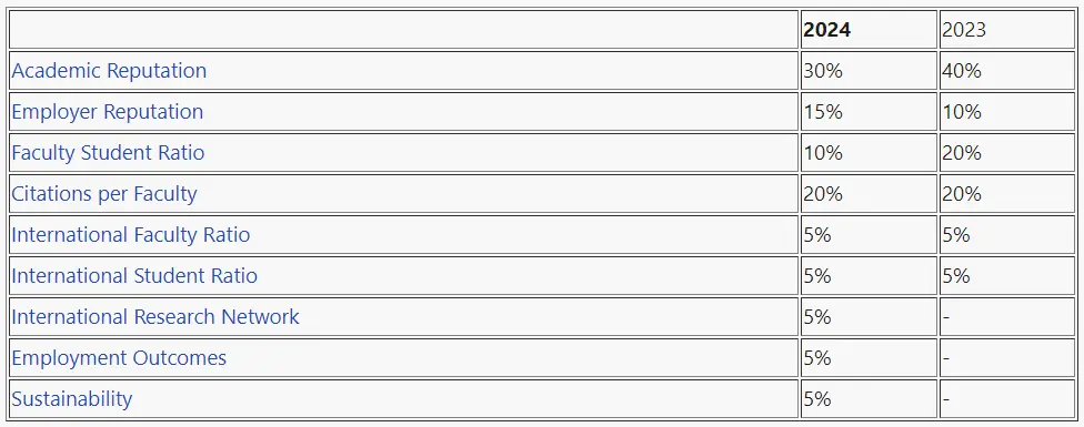 和2023年相较,调整后,学术声誉和师生比例两项都有所下降,也就是说在这两项评分落后的大学排名将会获得提升;