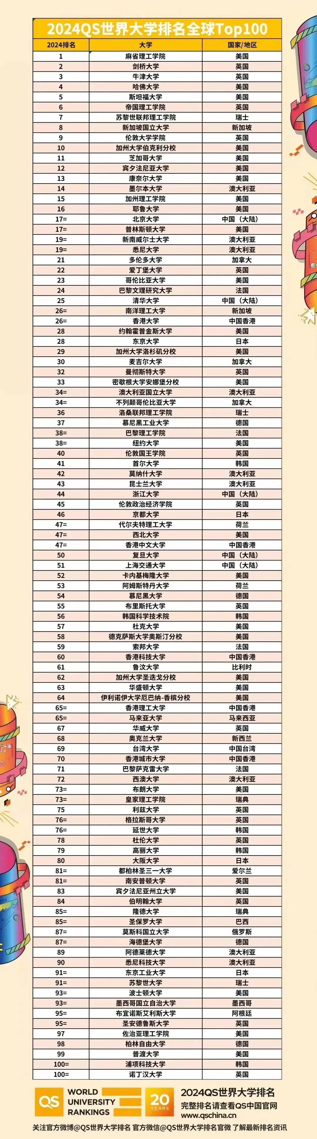世界大学排名全球Top20