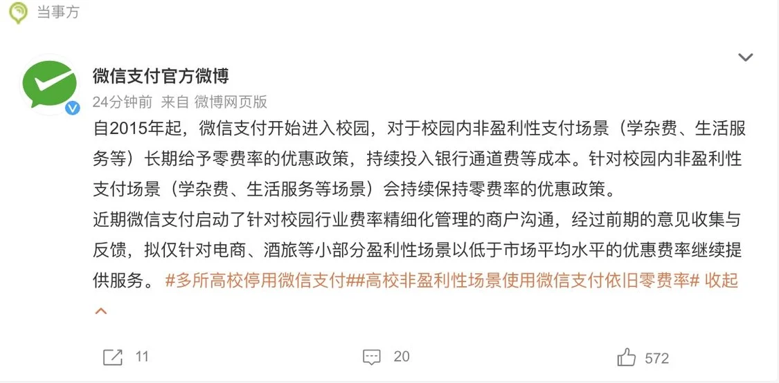 针对校园内非盈利性支付场景(学杂费、生活服务等场景)会持续保持零费率的优惠政策。近期微信支付启动了针对校园行业费率精细化管理的商户沟通,经过前期的意见收集与反馈,拟仅针对电商、酒旅等小部分盈利性场景以低于市场平均水平的优惠费率继续提供服务。