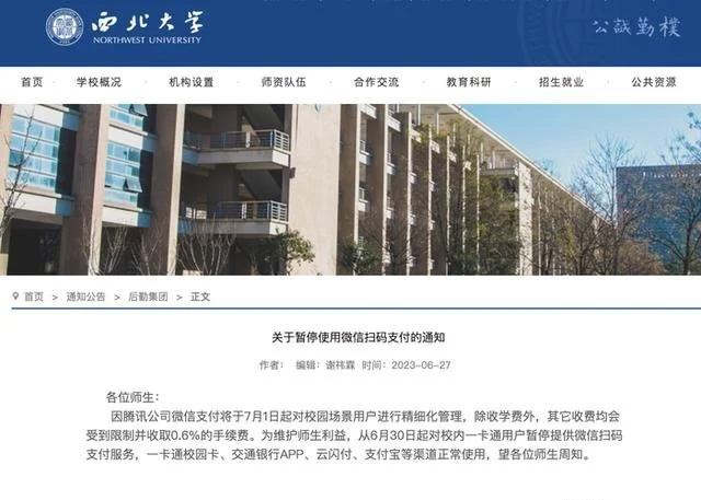 此前,西北大学发布公告称:因腾讯公司微信支付将于7月1日起对校园场景用户进行精细化管理,除收学费外,其它收费均会受到限制并收取0.6%的手续费。为维护师生利益,从6月30日起对校内一卡通用户暂停提供微信扫码支付服务,一卡通校园卡、交通银行APP、云闪付、支付宝等渠道正常使用,望各位师生周知。