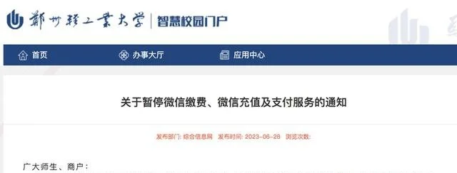 接到通知后,经多方了解和沟通,结合学校实际情况,学校决定自7月1日起暂停微信缴费、校内微信支付(校园卡微信充值和微信支付)服务。(校园卡充值、宿舍购电可使用支付宝;校内支付可使用:实体卡、虚拟卡和支付宝)。由此给大家带来的不便,敬请谅解,并请相互转告。