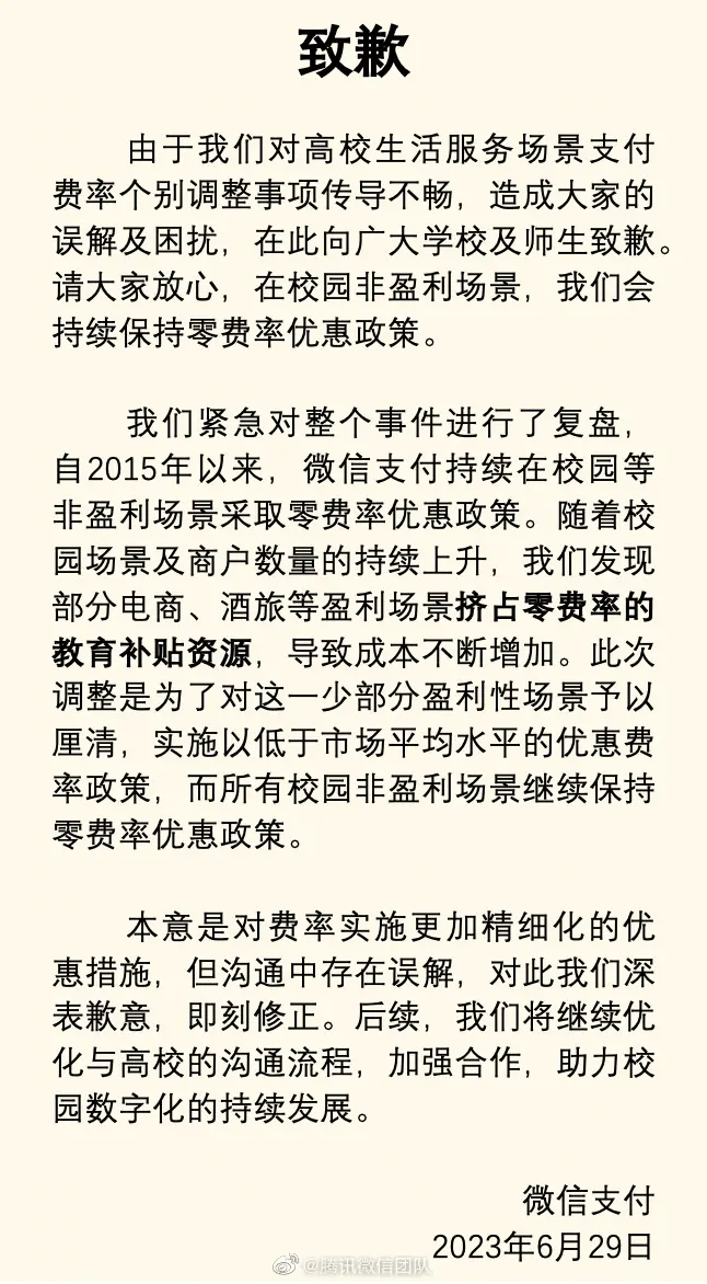 随后微信支付团队发出致歉信,称收费是基于成本压力,并强调在校园非盈利场景,微信支付会持续保持零费率的优惠政策。