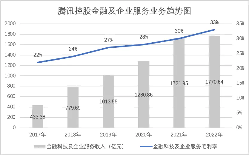 在腾讯财报中,支付业务相关收入被包含在“金融科技及企业服务”业务板块中,除了支付、理财等手续费和服务佣金收入外,该板块还包含云服务带来的收入。