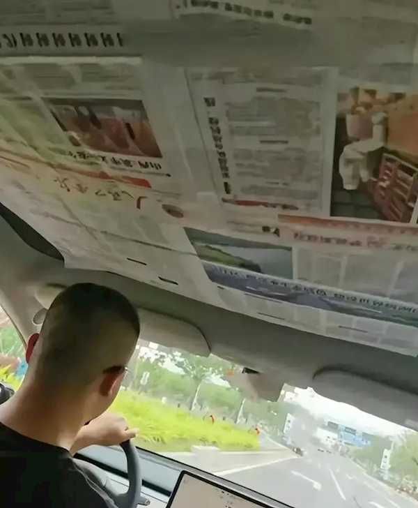 其实,网上吐槽特斯拉天幕早已有之了,解决方案也五花八门,有人在车里戴草帽,有人在车里打伞,有人在车顶贴满报纸。