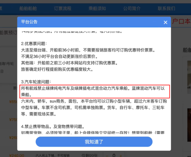 6月30日消息,近日有网友发帖称,大连到烟台的一轮渡禁止绿牌电车乘船。通过网络搜索后发现,大连港大连湾新港轮渡客运在平台公告中写明:“所有航线禁止绿牌纯电汽车及绿牌插电式混合动力汽车乘船。注:蓝牌混动汽车可以乘船。”运售票中心工作人员在接受采访时表示公告内容属实,至于为何绿牌纯电汽车不能乘船,工作人员没有给出明确解释。