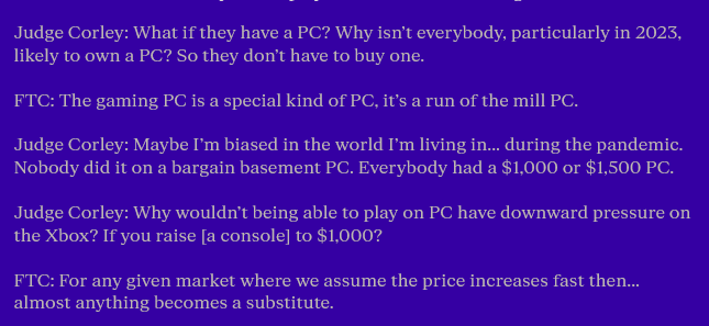 Corley 法官:如果他们有 PC 怎么办?为什么所有人,特别是在 2023 年,都很可能拥有自己的电脑的情况下?所以他们并不一定要买一台(Xbox)。