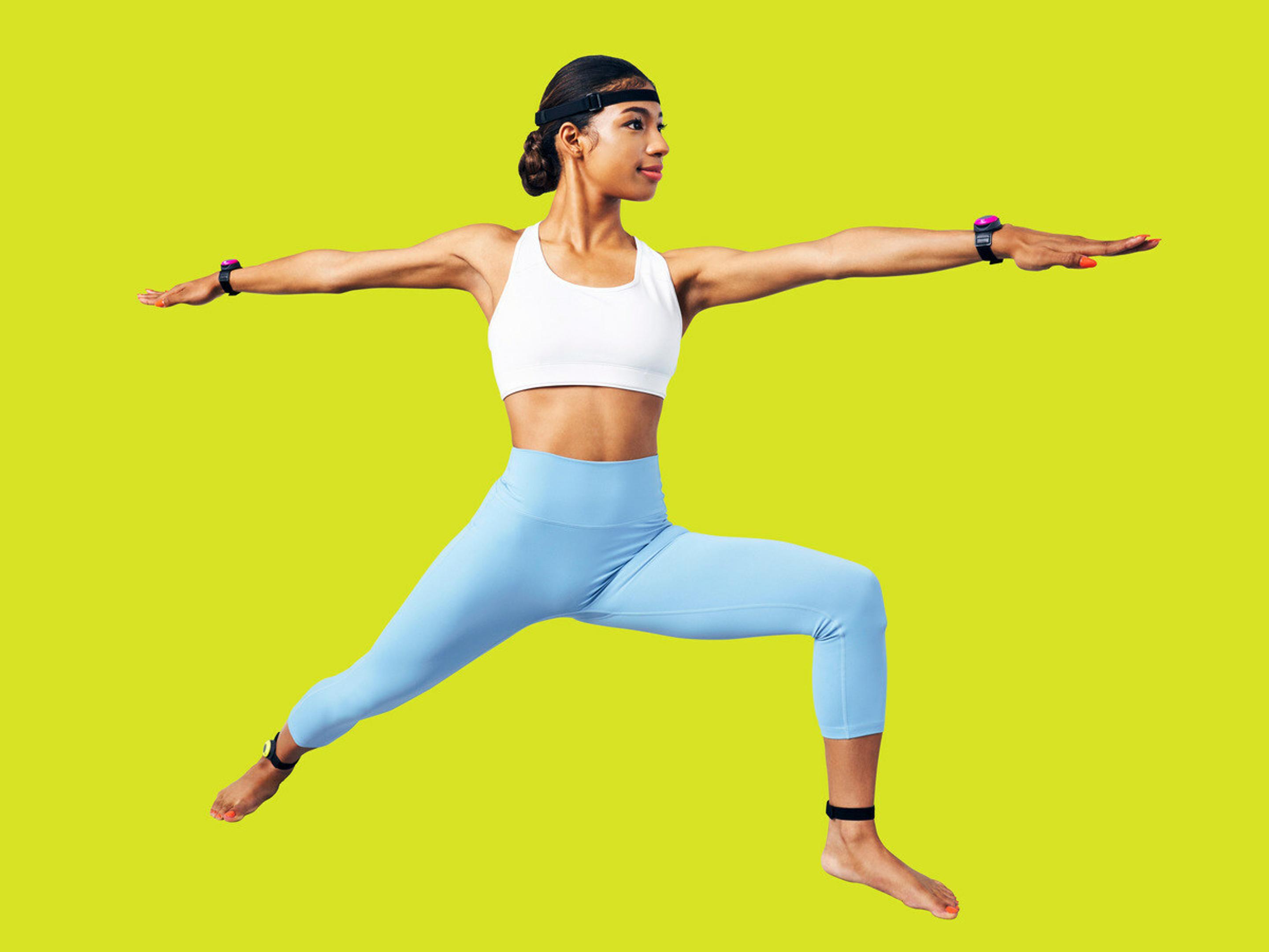 用户佩戴的六个Mocopi追踪器与一个配套的移动应用程序一起工作,为视频或虚拟现实创建一个头像。
