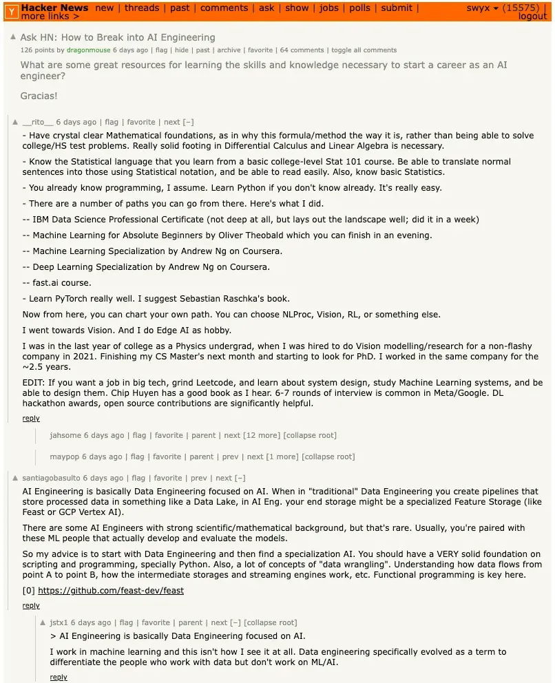 Hacker News 上 2023 年 6 月一个帖子的截图:“如何进入 AI 工程”的热门投票答案。