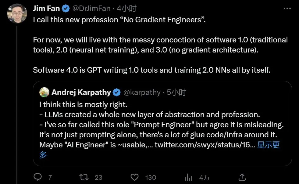 在讨论中,也有人提出了“认知工程师”、“AI 系统工程师”等名称作为候选,英伟达 AI 科学家 Jim Fan 认为这种新兴的职业应该被称为“无梯度工程师”—— 从传统工具 1.0,到神经网络 2.0,再到无梯度架构的 3.0,我们终于等来了 GPT 系列自我训练的 4.0 版本。