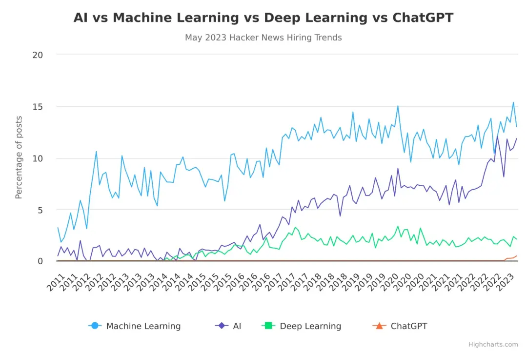 HN Who’s Hiring(其是 Hacker News 上的一个月度帖子,它提供了一个平台,供雇主发布招聘信息) 不同类别的月度就业趋势