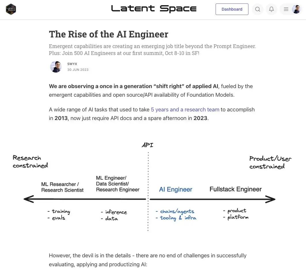 我们知道,每家创业公司都有某种讨论 AI 使用的 Slack 频道,很快这些渠道将从非正式团体转变为正式团队。目前,成千上万的软件工程师正致力于生产 AI API 和 OSS 模型,无论是在上班时间还是晚上和周末,在公司 Slacks 或独立 Discords 中,这一切都将专业化并集中在一个头衔上:AI 工程师。