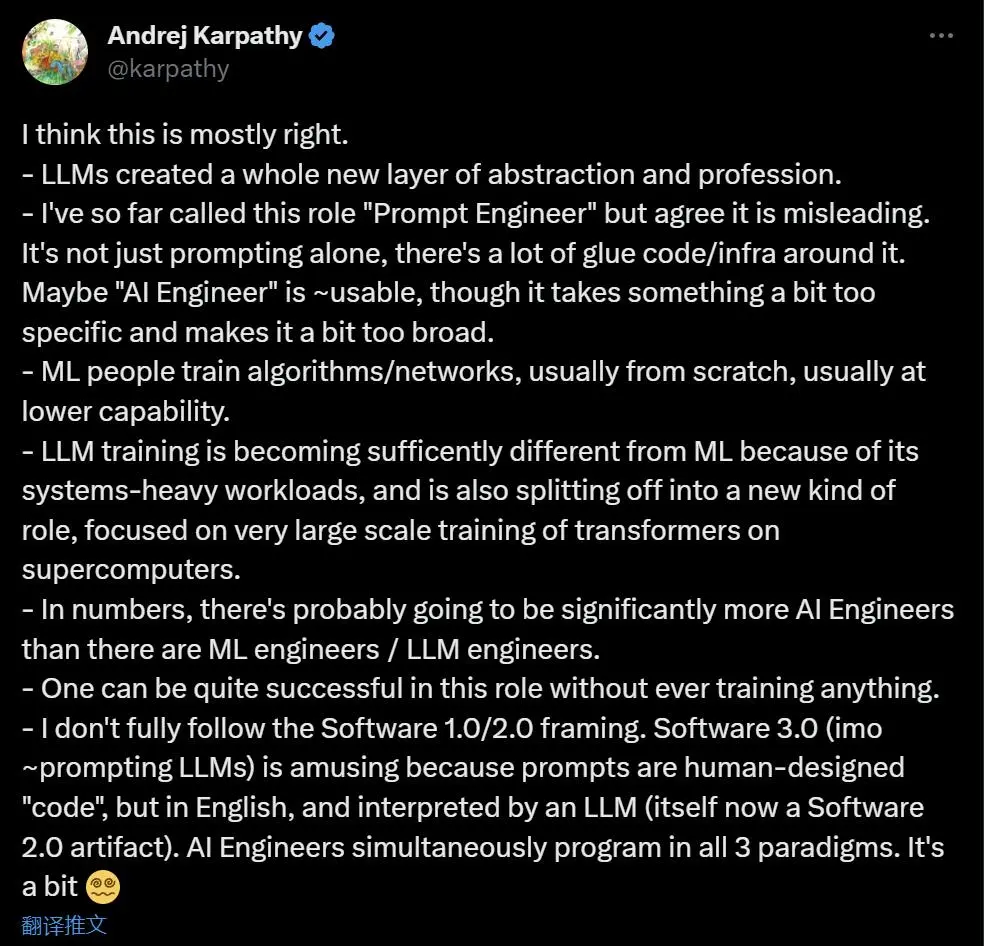 想法一出,AI 领域大 v 们迅速有了点评。OpenAI 科学家、前特斯拉 AI 和自动驾驶主管 Andrej Karpathy 表示赞同。“大模型创建了一个全新的抽象和专业层,到目前为止,我把它称为『提示工程师』,但现在不止是提示的问题。”