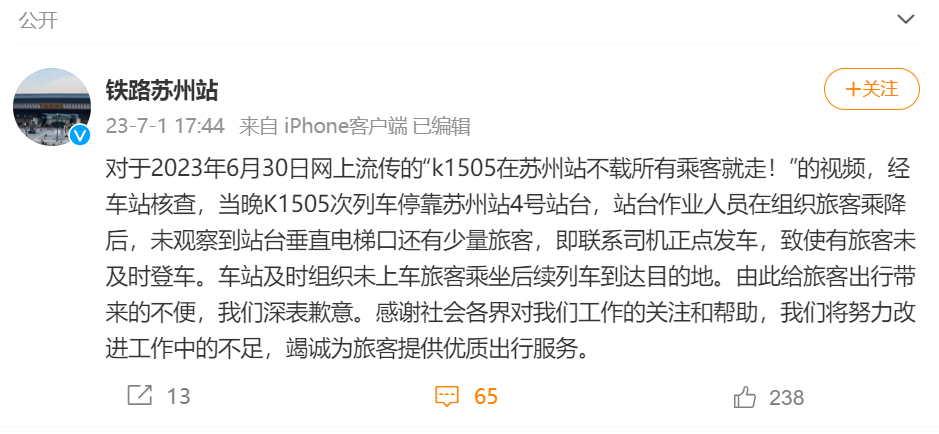 日前有网友发视频称,在苏州火车站遇到了不载所有乘客就走的问题,今天下午铁路苏州站官方微博也回应了此事,对此表示致歉。苏州站表示,对于2023年6月30日网上流传的“k1505在苏州站不载所有乘客就走!”的视频,经车站核查,当晚K1505次列车停靠苏州站4号站台,站台作业人员在组织旅客乘降后,未观察到站台垂直电梯口还有少量旅客,即联系司机正点发车,致使有旅客未及时登车。