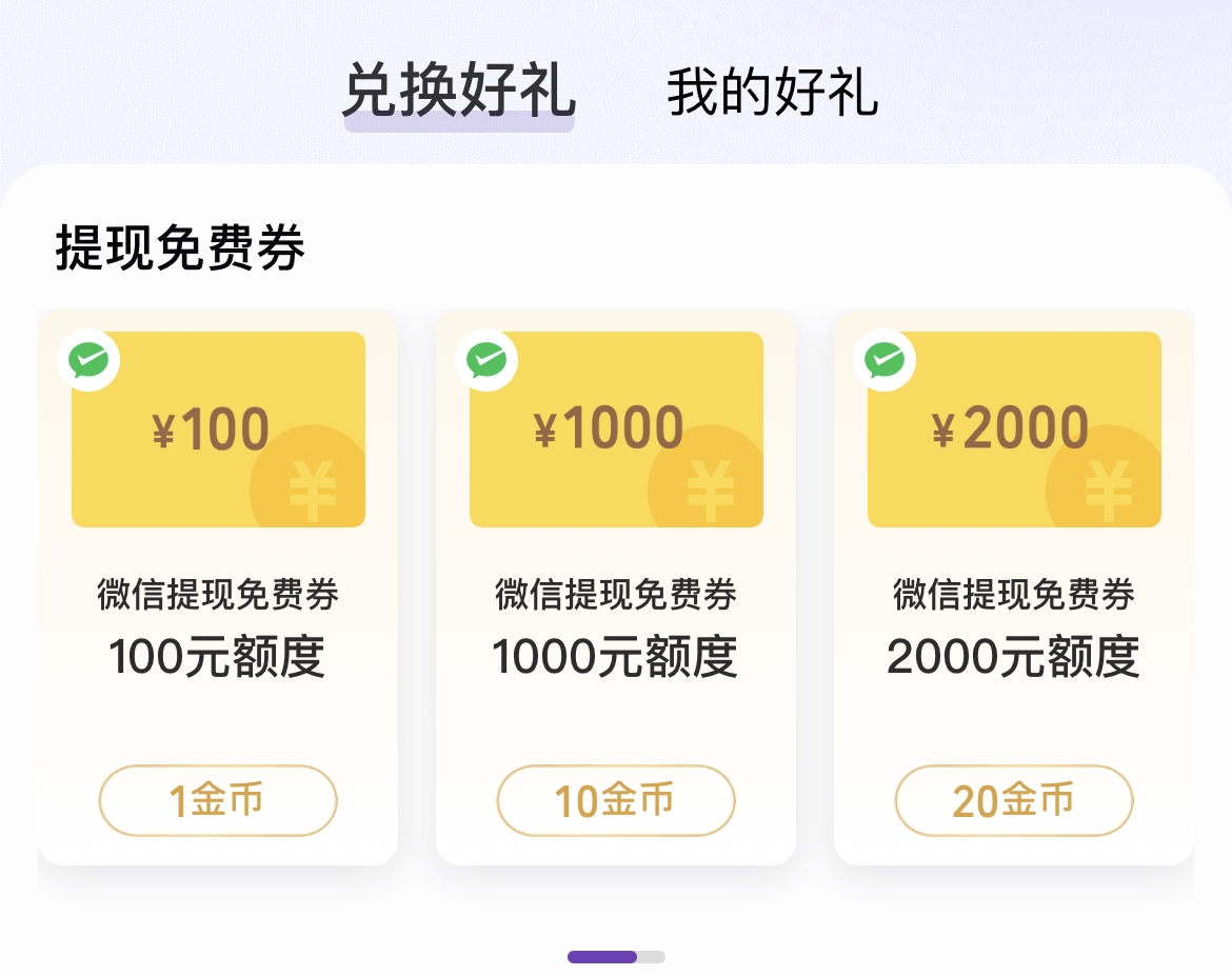 日前,微信支付有优惠的1000元、2000元微信提现免费券回归,前者需要10金币、后者需要20金币兑换。